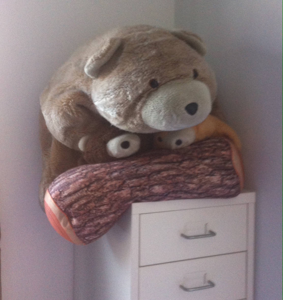 Macadamia CaveMacadamia is on the small side for a bear, but fits perfectly in his cave on top of a cabinet in Kristin and Andy’s bedroom, where he resides with a log (yet another story to post!) and his brothers, Malachi and Stony (you’ll have to wait for Stony’s blog to see why Stony doesn’t start with M!).  They can’t live on the bed because the cats love them too much!
