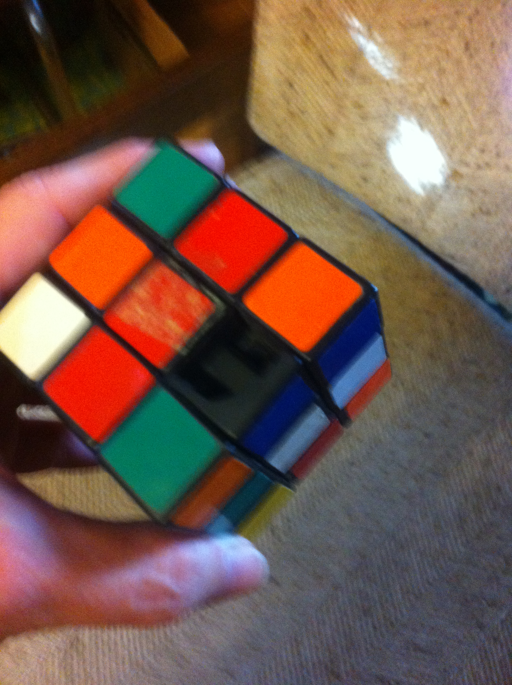 photo 1I just traded out the little bit of black for green and added one extra column and I was in business!  Then came the actual doing, which involved graph paper and solving (at least one face) of 120 cubes.  The whole project took about three hours, I think.  And it was tricky, because these are OLD cubes that have stickers that have fallen off… one even has a broken-out hole in it.  So I had to figure out which cube had enough stickers to do which 3×3 quadrant.  😉  In any case, here is the result–snow drops, which are very appropriate given all the snow we’ve gotten lately!  🙂photo 2
