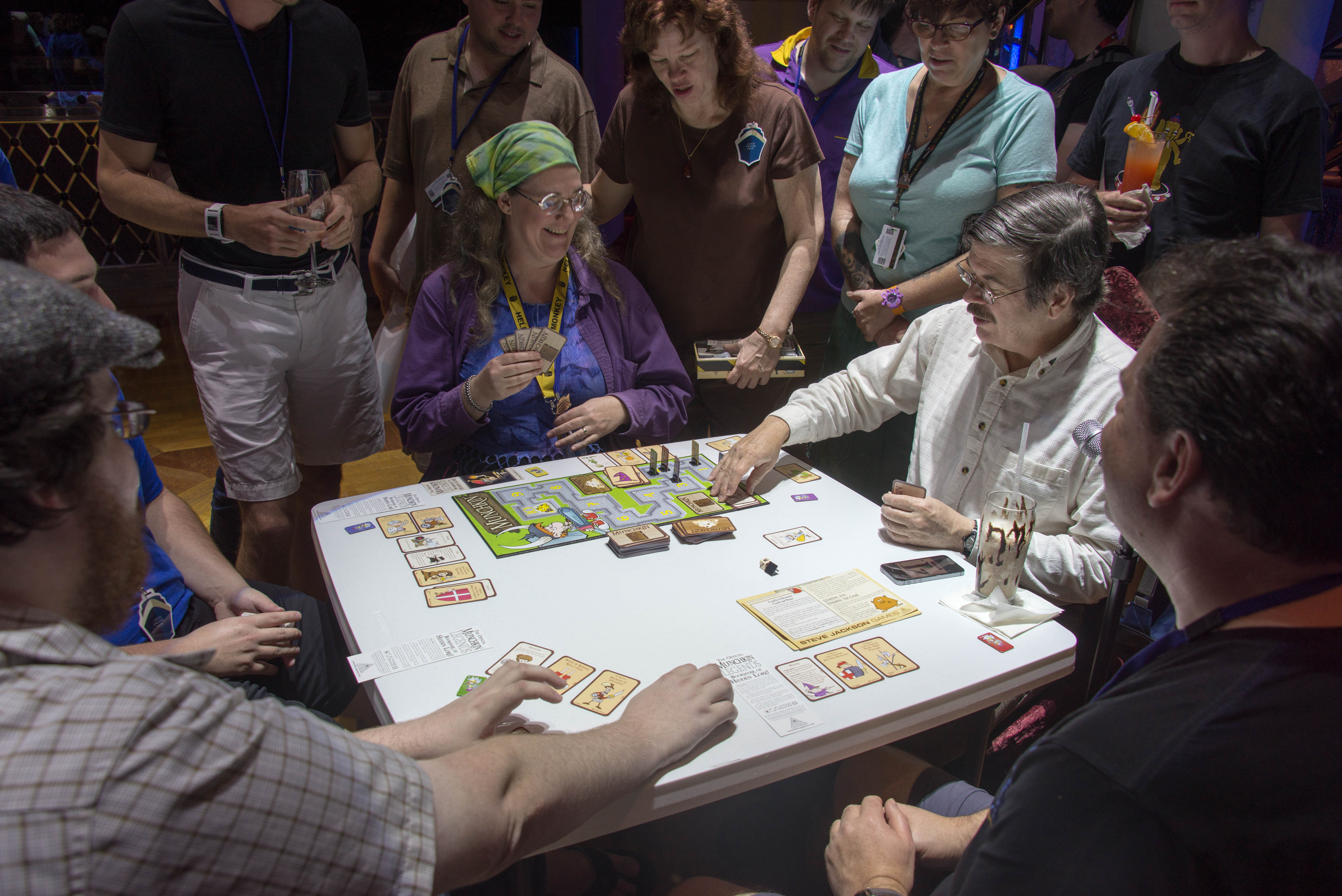 16309372279_d697e49094_oAnd then there was Celebrity Munchkin.  Remember that at the Table Top Taste Test you got to enter a raffle to play games with the celebrities?  Well, one of those possibilities was playing Munchkin with inventor Steve Jackson.  Kristin had admitted earlier in the cruise that she had never played Munchkin and would love it if Steve taught her, so he invited her to play her first game at the celebrity event!  And, with the help of an advisor from the audience and an ally at the table, Kristin won!  She gave the two prizes (valuable game cards) to her two helpers, so it was a win-win-win!