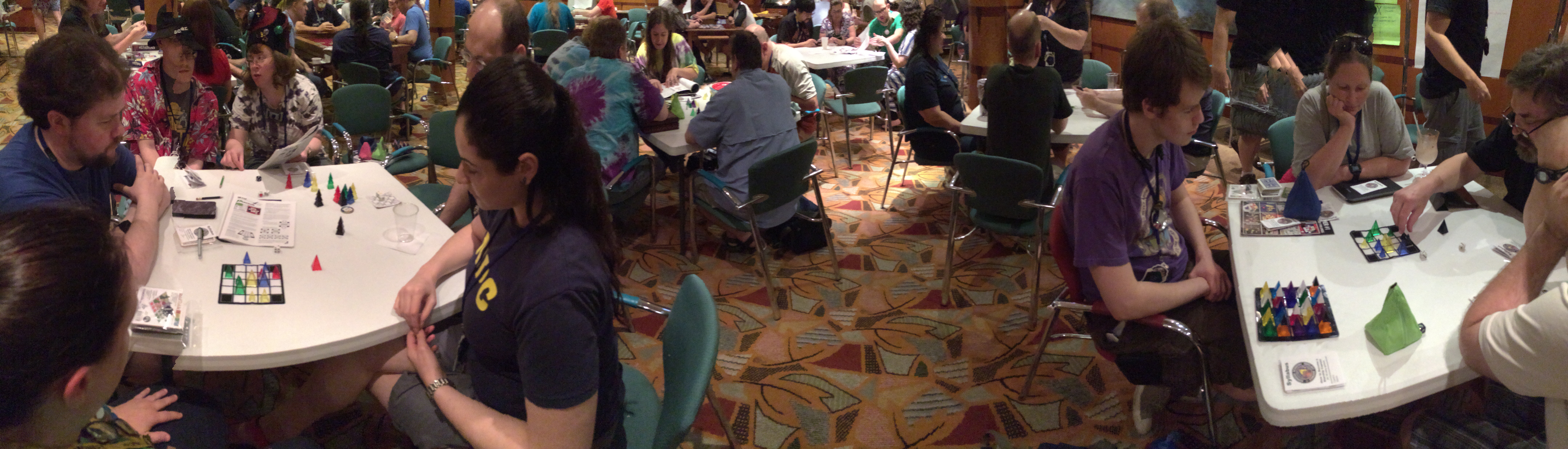 Playing with Pyramids PanoNext came Playing with Pyramids, a four-hour event in which we gave out Starship Cadet training booklets and challenged participants to become Starship Captains by learning ten pyramid games.  You can see Leila on the left, me in the middle, and Kristin’s table (she’s taking the picture) on the right.  The event was this busy for not only the scheduled four hours, but another two after that, and only ended because we insisted on going to dinner despite protests of those who wanted us to stay and teach them more.  🙂  I know of at least one person who learned ten games and earned his Starship Captainship all during this one event!  And Sage–the guy in the purple shirt in the photo–waited for hours for a chance to learn Homeworlds.  Thanks for your patience, Sage!
