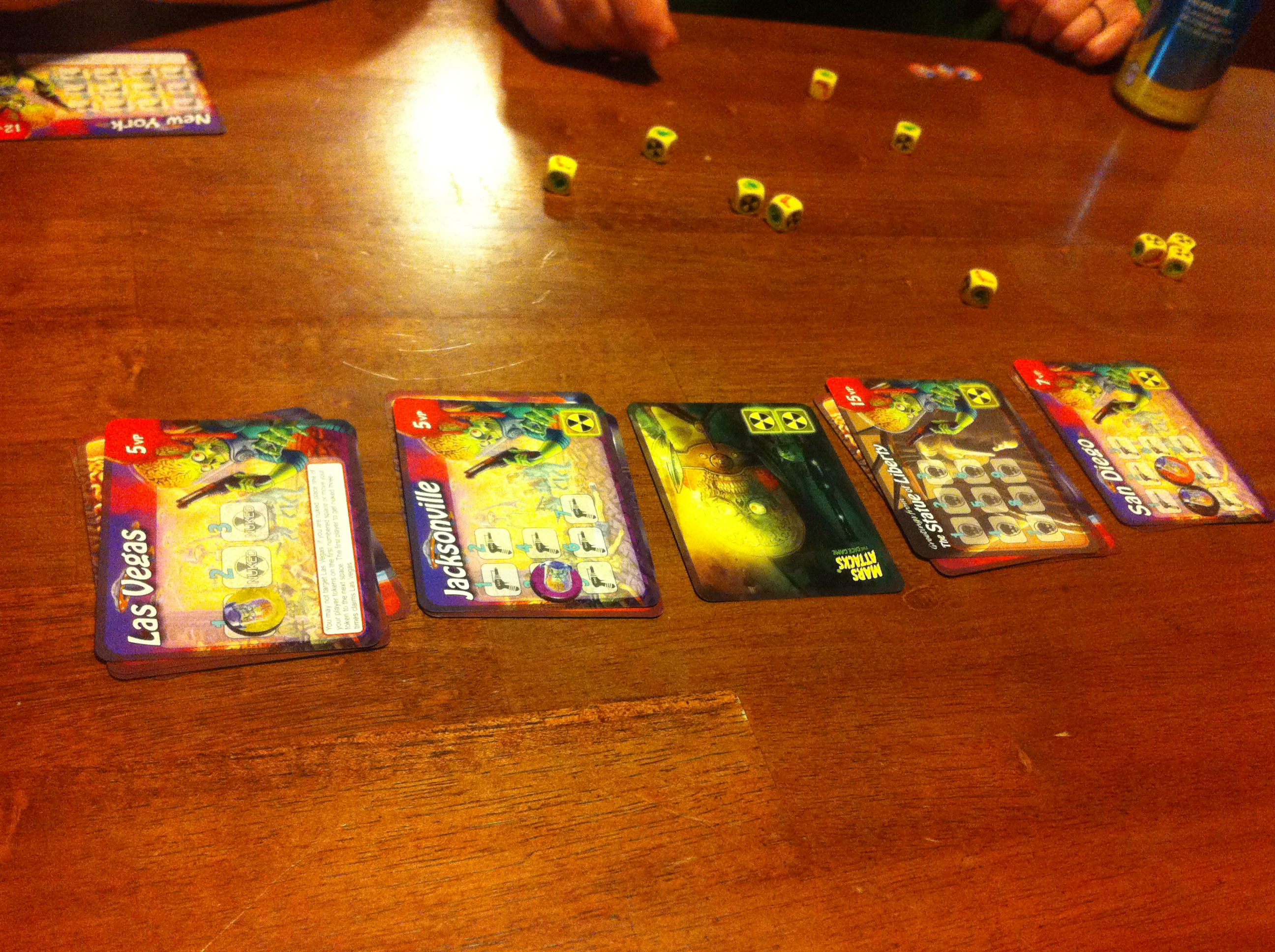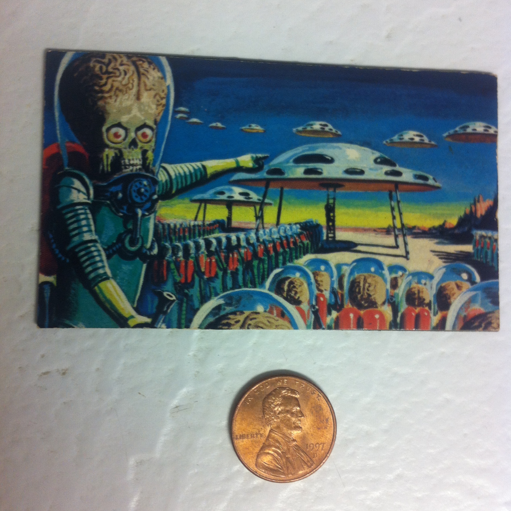 Ack!  It’s been two weeks!  Where does the time go???  Sorry for the long hiatus… hopefully I’ll do better! photoA little while ago I played a new game at game night that fits perfectly with tonight’s topic.  The game was called Mars Attacks:  The Dice Game by Steve Jackson Games.  Not only was it a very fun press-your-luck game that I’m looking forward to playing again, but it was perfect timing to fit with Magnet #5, which is the first in a series of magnets that are images from collectible trading cards.  This particular magnet was the first in the series, entitled “The Invasion Begins.”  I’ve got a lot more to tell you about Mars Attacks, but I’ll spread it out over the various fridge magnets as they come up.  🙂  For now, go buy the game–it’s fun! photo 5 photo 2